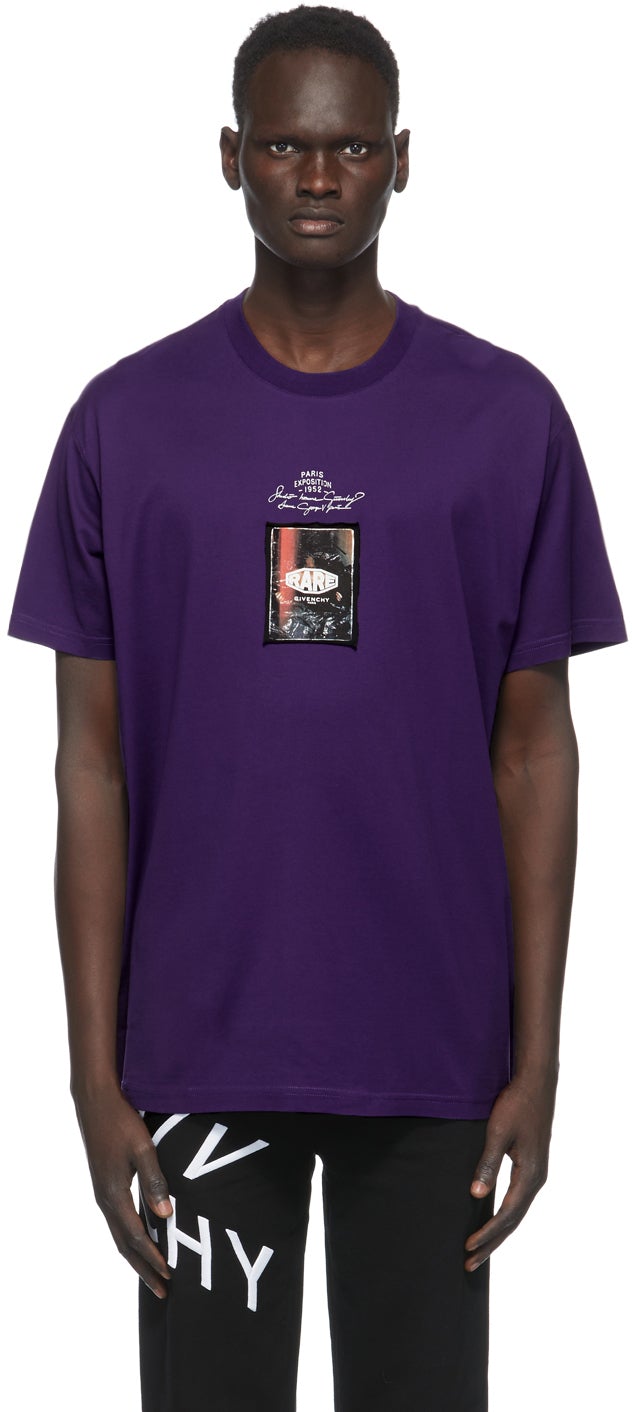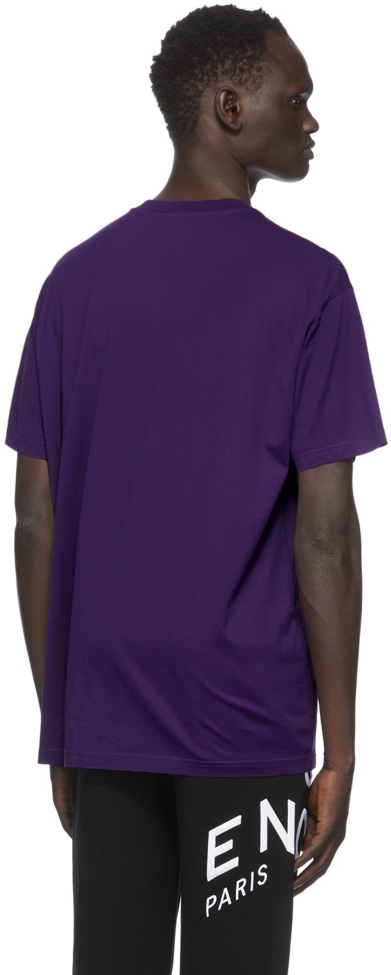 Short sleeve cotton jersey T-shirt in purple. Rib knit crewneck collar. Text printed in white and multicolor graphic logo patch at front. Supplier color: Dark purple 100% cotton. Brand: Givenchy