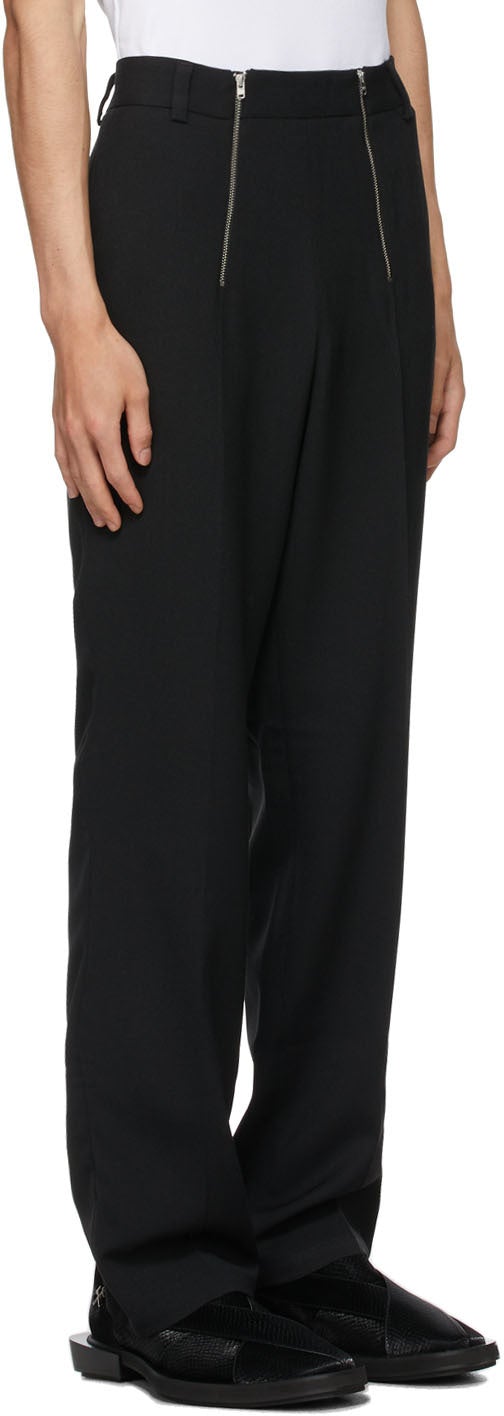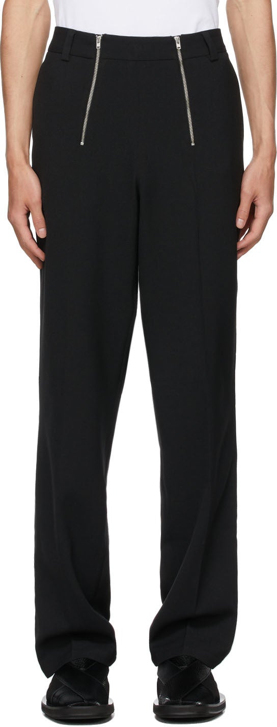 Slim-fit stretch virgin wool-blend twill trousers in black. Mid-rise. Three-pocket styling. Belt loops at waistband. Twin zippered vents at front. Pinched seams at front and back. Darts at back waistband. Concealed button-fly. Silver-tone hardware. Supplier color: Black 53% polyester, 44% virgin wool, 3% elastane. Brand: GmbH