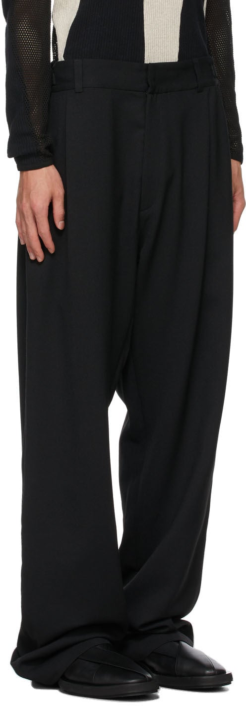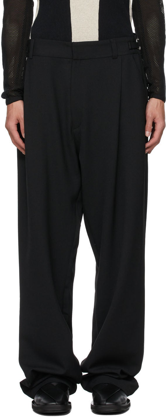 Straight-leg virgin wool twill trousers in black. Mid-rise. Three-pocket styling. Belt loops and webbing straps with cinch fastening at waistband. Pleats at front. Zip-fly. Silver-tone hardware. Supplier color: Black 100% virgin wool. Brand: GmbH