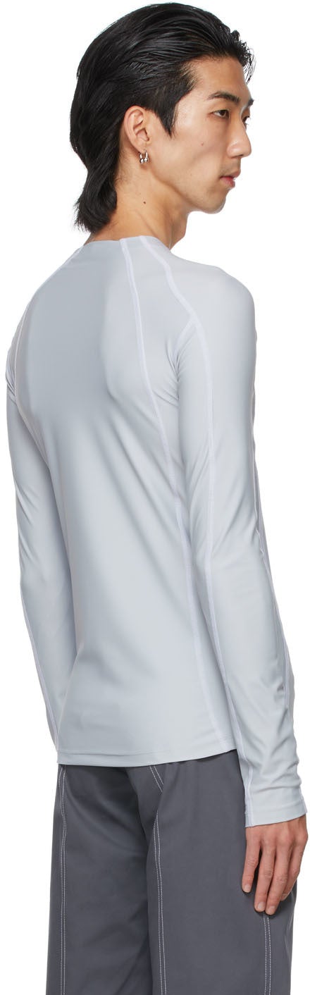 Long sleeve stretch nylon jersey T-shirt in grey. Overlock stitching in white throughout. Mock neck collar. Twin zippered vents at front. Tonal hardware. Supplier color: Grey 78% recycled nylon, 22% elastane. Brand: GmbH