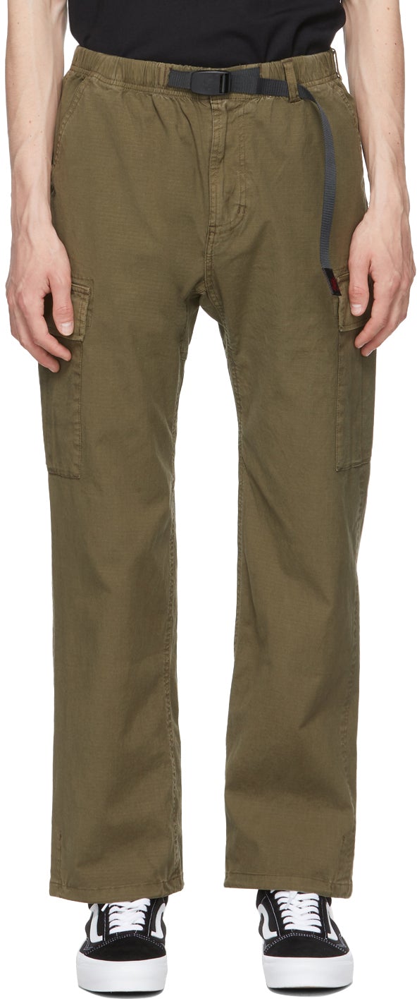 Straight-leg stretch cotton ripstop cargo pants in green. Mid-rise. Four-pocket styling. Belt loops and integrated adjustable cinch belt at elasticized waistband. Textile logo patch in black at belt end and back pocket. Gusset at inseam. Flap pocket at outseams. Zip-fly. Logo-engraved black and gold-tone hardware. Supplier color: Olive 97% cotton, 3% polyurethane. Brand: Gramicci