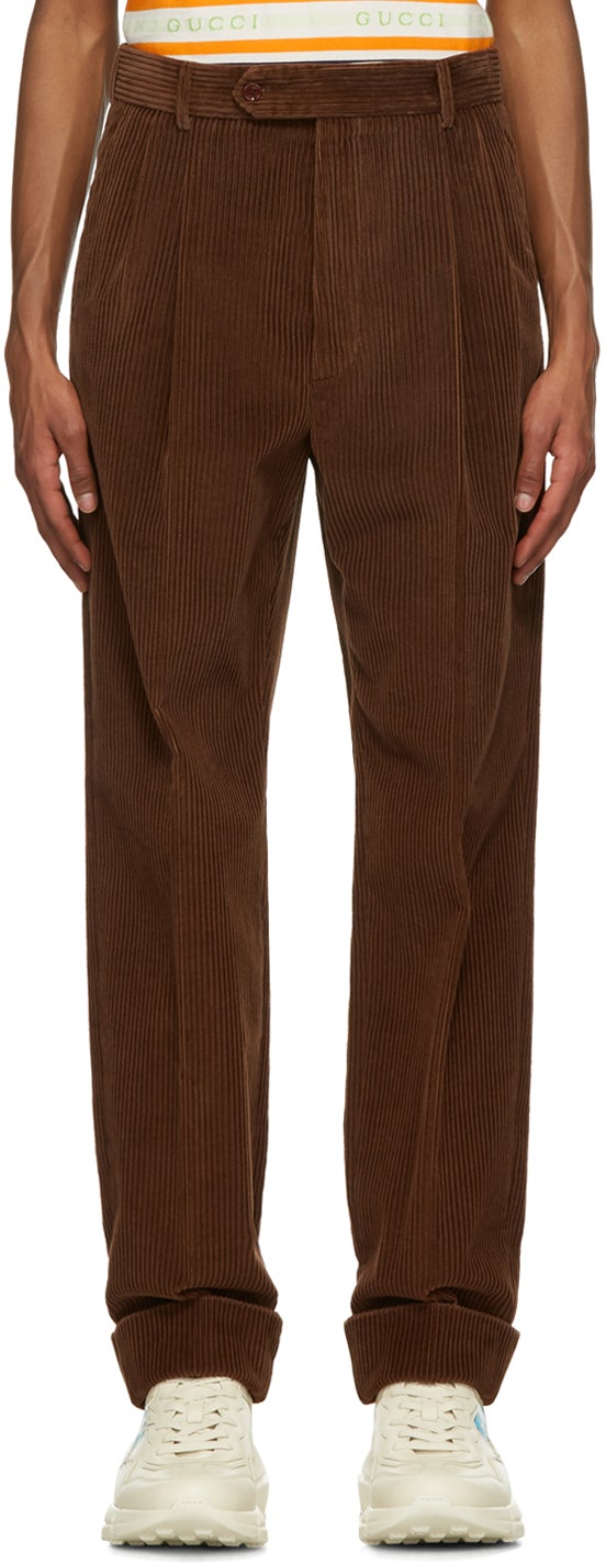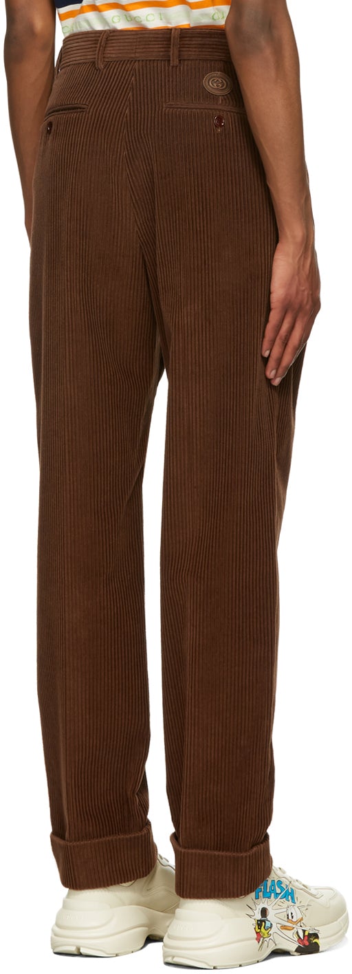Straight-leg corduroy trousers in brown. Mid-rise. Four-pocket styling. Adjustable button-tab at waistband. Embossed leather logo patch at back pocket. Rolled cuffs. Zip-fly. Supplier color: Noix 100% cotton. Brand: Gucci