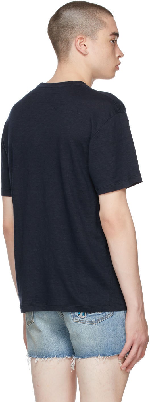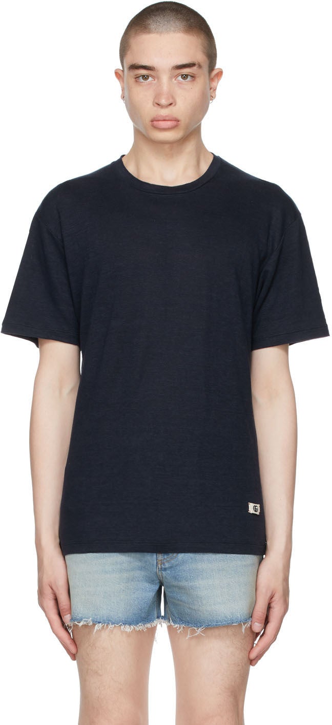 Short sleeve linen jersey T-shirt in navy. Rib knit crewneck collar. Embroidered logo patch in beige and black at front hem. Supplier color: Blue 100% linen. Brand: Gucci