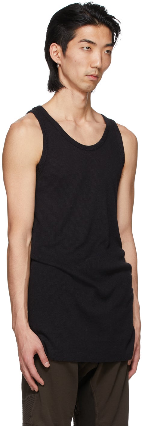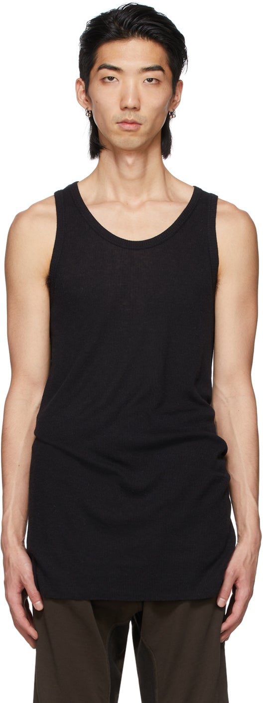 Sleeveless semi-sheer rib knit wool-blend tank top in black. Scoop neck collar. Extended hem. Supplier color: Black 40% wool, 30% rayon, 30% nylon. Brand: Haider Ackermann