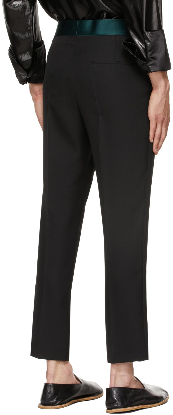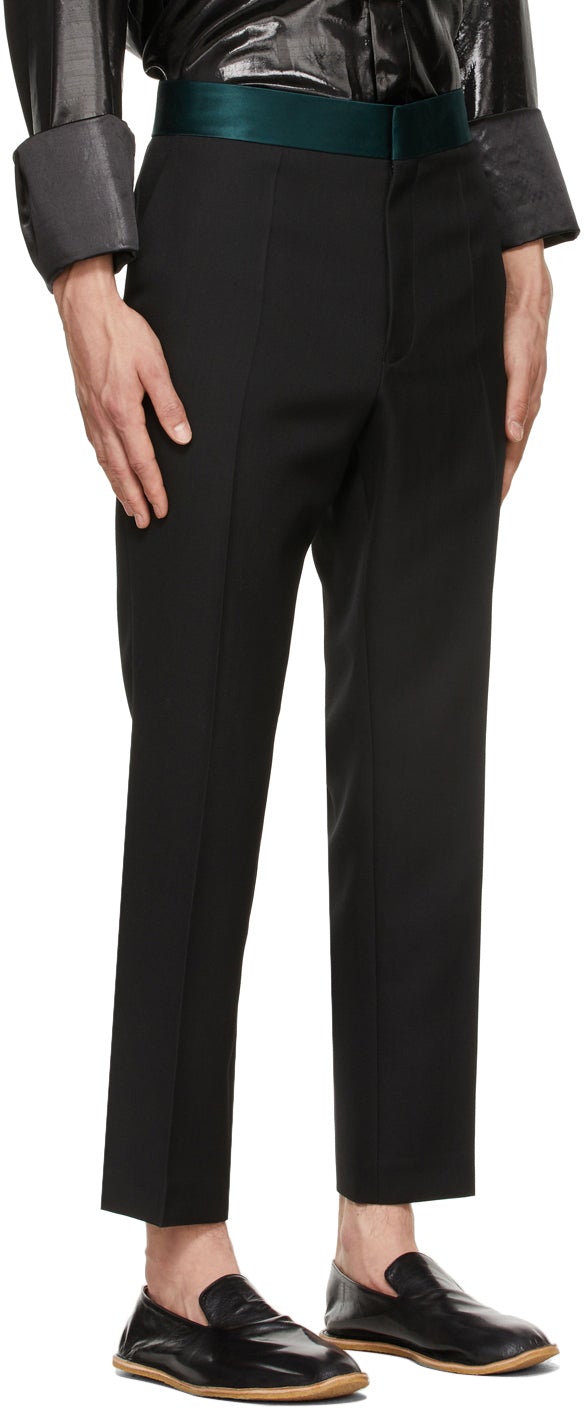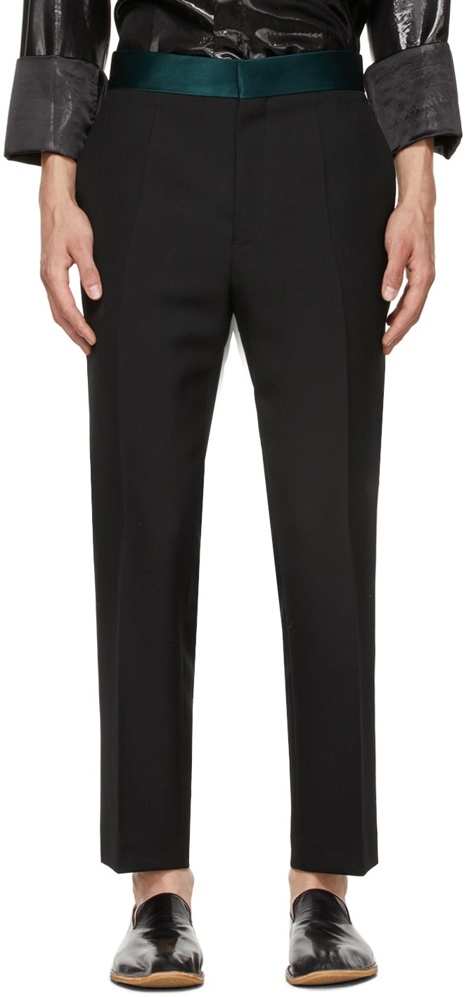 Slim-fit plain-woven wool trousers in black. Mid-rise. Three-pocket styling. Silk satin waistband in green. Central creases at front and back. Zip-fly. Tonal hardware. Supplier color: Calder Body: 100% wool. Trim: 100% silk. Lining: 51% cotton, 49% rayon. Brand: Haider Ackermann