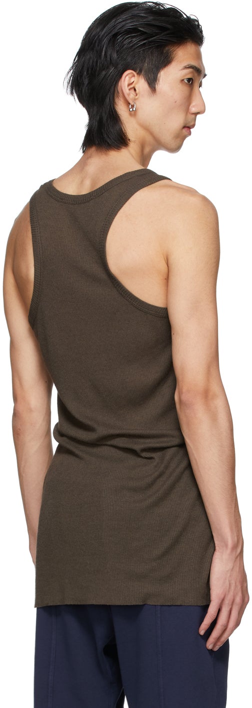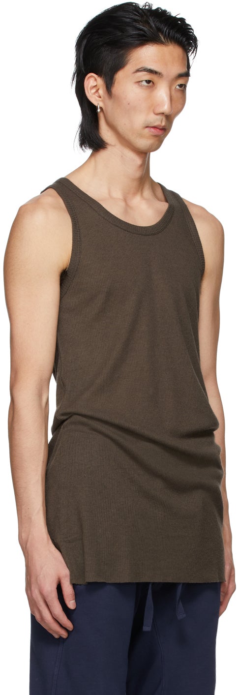 Sleeveless semi-sheer rib knit wool-blend tank top in brown. Scoop neck collar. Extended hem. Supplier color: Vison 40% wool, 30% rayon, 30% nylon. Brand: Haider Ackermann