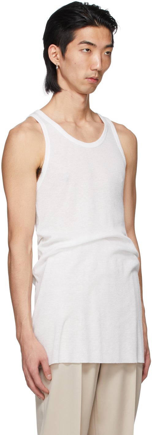 Sleeveless semi-sheer rib knit wool-blend tank top in white. Scoop neck collar. Extended hem. Supplier color: Ivory 40% wool, 30% rayon, 30% nylon. Brand: Haider Ackermann