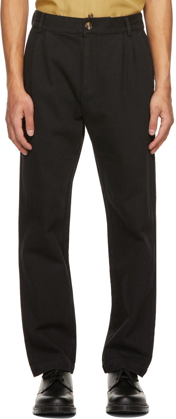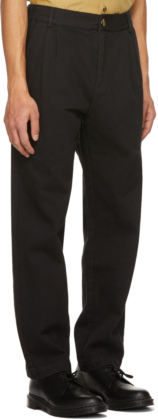 Tapered cotton twill trousers in black. Mid-rise. Four-pocket styling. Belt loops at partially elasticized waistband. Pleats and tonal logo embroidered at front. Zip fly. Tortoiseshell hardware. Supplier color: Black 100% cotton. Brand: Han Kjobenhavn