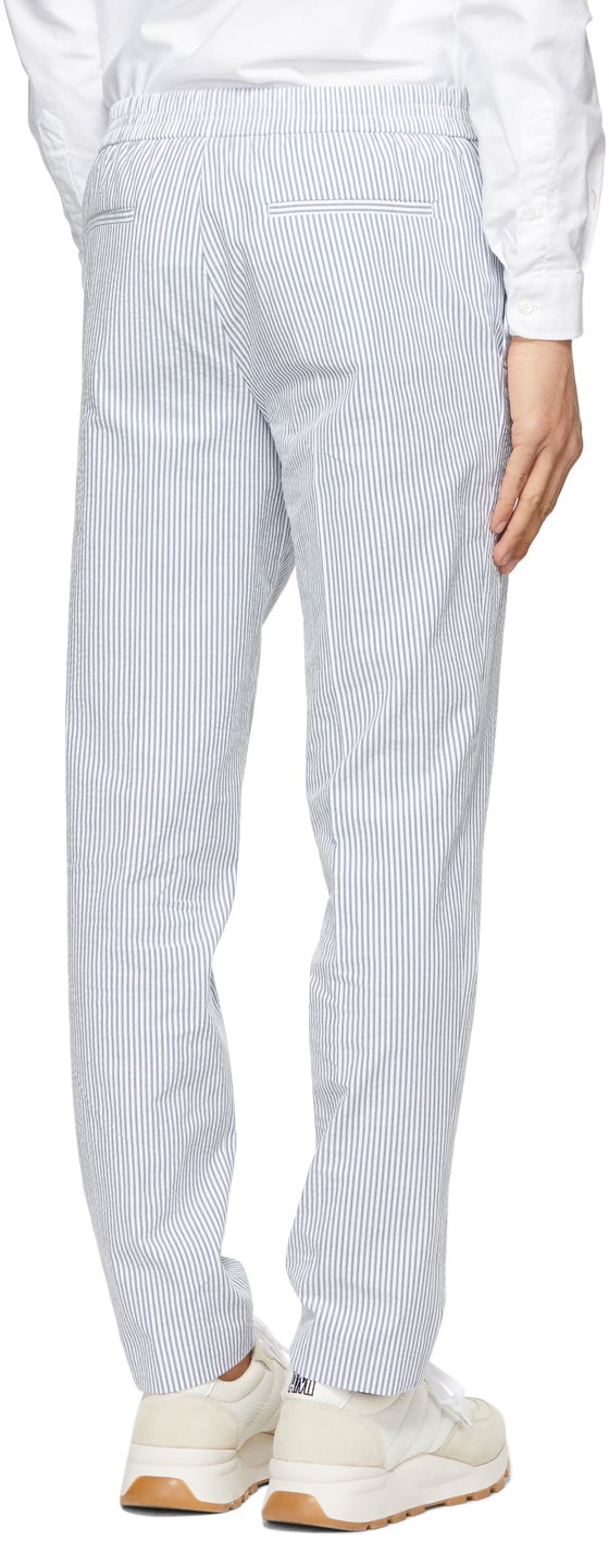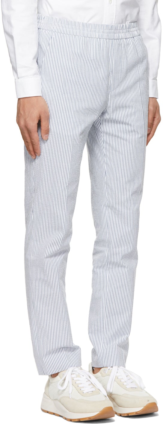 Slim-fit cotton seersucker trousers striped in blue and white. Mid-rise. Four-pocket styling. Elasticized waistband. Central crease at legs. Mock-fly. Tonal hardware. Supplier color: Blue striped 100% cotton. Brand: Harmony