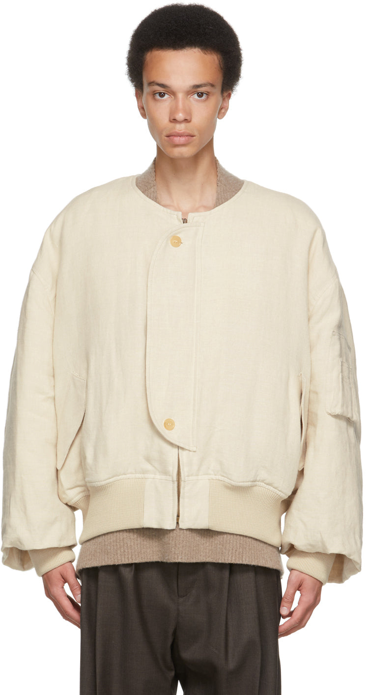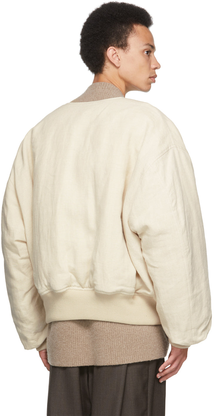 Long sleeve padded woven linen bomber jacket in beige. Band collar. Partially concealed zip closure with two-button placket at front. Welt pockets at waist. Zippered utility pocket at sleeve. Rib knit cuffs and hem. Welt pockets and patch pocket at interior. Tonal quilted cotton jersey lining. Fully lined. Tonal and bronze-tone hardware. Supplier color: Ecru Body: 100% linen. Lining: 100% cotton. Brand: Hed Mayner