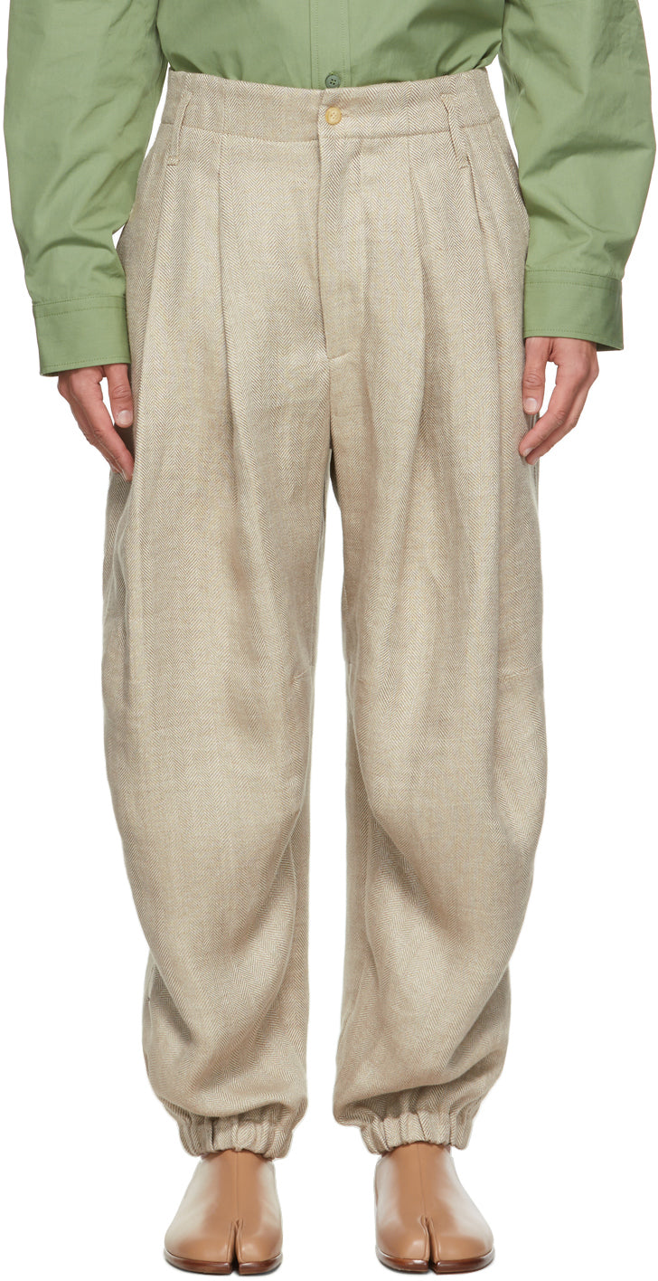 Wide-leg linen herringbone trousers in tones of taupe. High-rise. Four-pocket styling. Belt loops at waistband. Pleats at front legs. Darts at knees and back waistband. Elasticized cuffs. Zip-fly. Tonal and silver-tone hardware. Supplier color: Taupe 100% linen. Brand: Hed Mayner