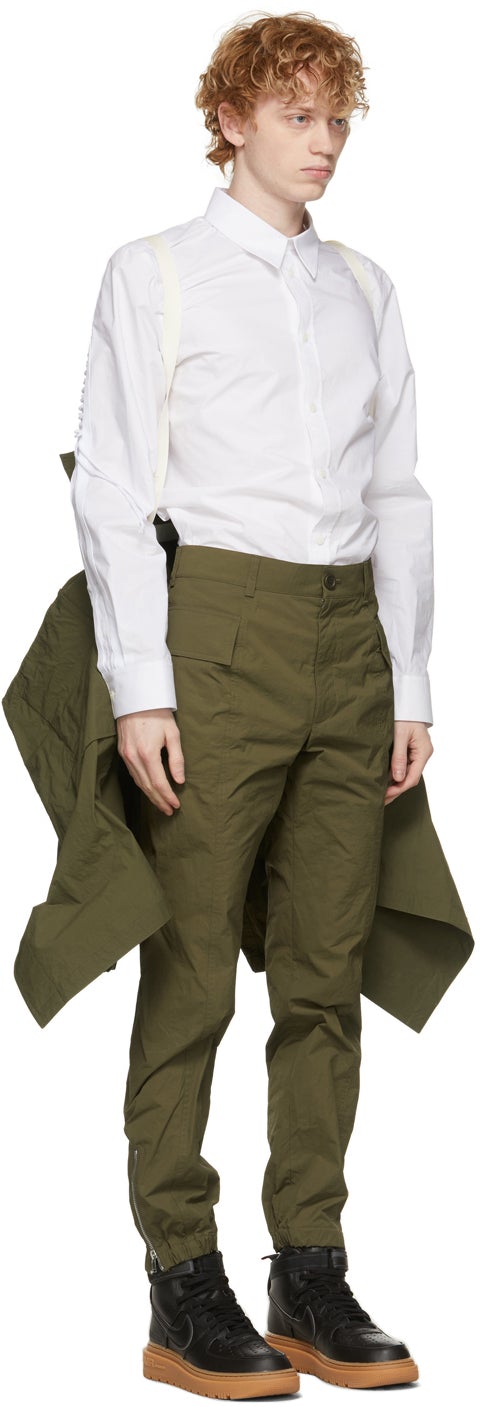 Long sleeve crinkled nylon taffeta coat in khaki. Bungee-style drawstring at hood. Stand collar. Press-stud closure at front. Welt pockets at waist. Elasticized cuffs. Logo printed in white at back. Adjustable shoulder straps at interior. Unlined. Tonal and white hardware. Supplier color: Burnt olive 100% polyamide. Brand: Helmut Lang
