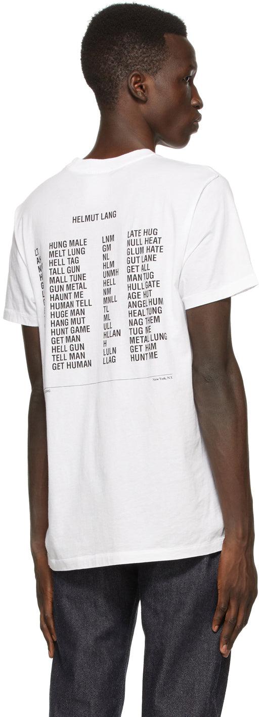 Short sleeve cotton jersey T-shirt in white. Rib knit crewneck collar. Text printed in black at chest. Text printed in black at back. Available exclusively at SSENSE. Supplier color: White/Black 100% cotton. Brand: Helmut Lang