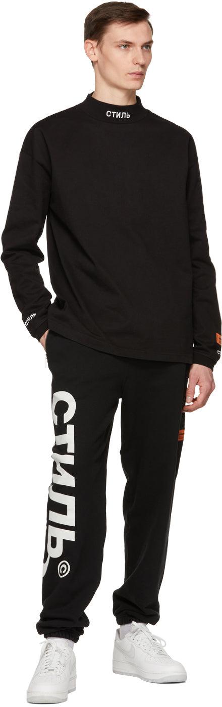 Relaxed-fit French terry lounge pants in black. Mid-rise. Three-pocket styling. Concealed drawstring at elasticized waistband. Textile logo patch in orange at front. Textile logo patch in white at back pocket. Text printed in white at outseam. Elasticized cuffs. Silver-tone hardware. Supplier color: Black/White Body: 100% cotton. Trim: 95% cotton, 5% elastane. Brand: Heron Preston