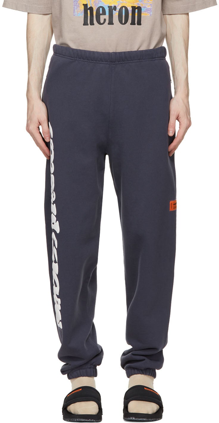 Relaxed-fit French terry lounge pants in navy. Mid-rise. Three-pocket styling. Concealed drawstring at elasticized waistband. Logo printed in white at front leg. Textile logo patch in orange and white at front leg and back pocket. Elasticized cuffs. Logo-engraved silver-tone hardware. Supplier color: Anthracite/White Body: 100% cotton. Trim: 95% cotton, 5% elastane. Brand: Heron Preston