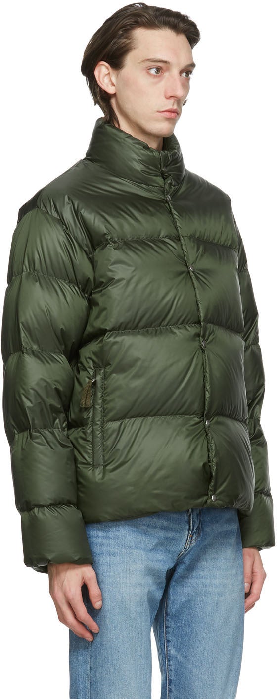 Long sleeve down-filled quilted Limonta™ technical satin jacket in green. Snow, wind, and water-proof. Stand collar. Concealed two-way zip closure with press-stud placket at front. Zippered pockets at waist. Graphic appliqué in blue, red, and yellow at front hem. Logo patch embroidered in red and green at upper sleeve. Elasticized cuffs. Textile logo patch in red and white at back collar. Zippered pocket in red and logo patch at interior. Khaki satin lining. Logo-engraved gunmetal-tone hardware. Supplier color: Green Fill: 90% goose down, 10% feather. Body: 100% polyester. Brand: Holubar