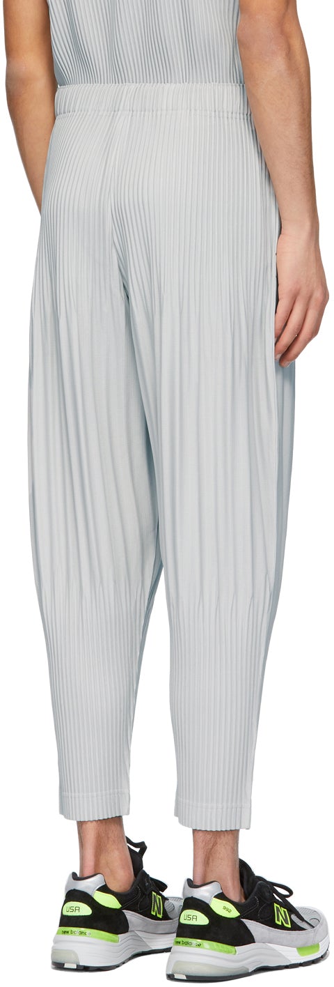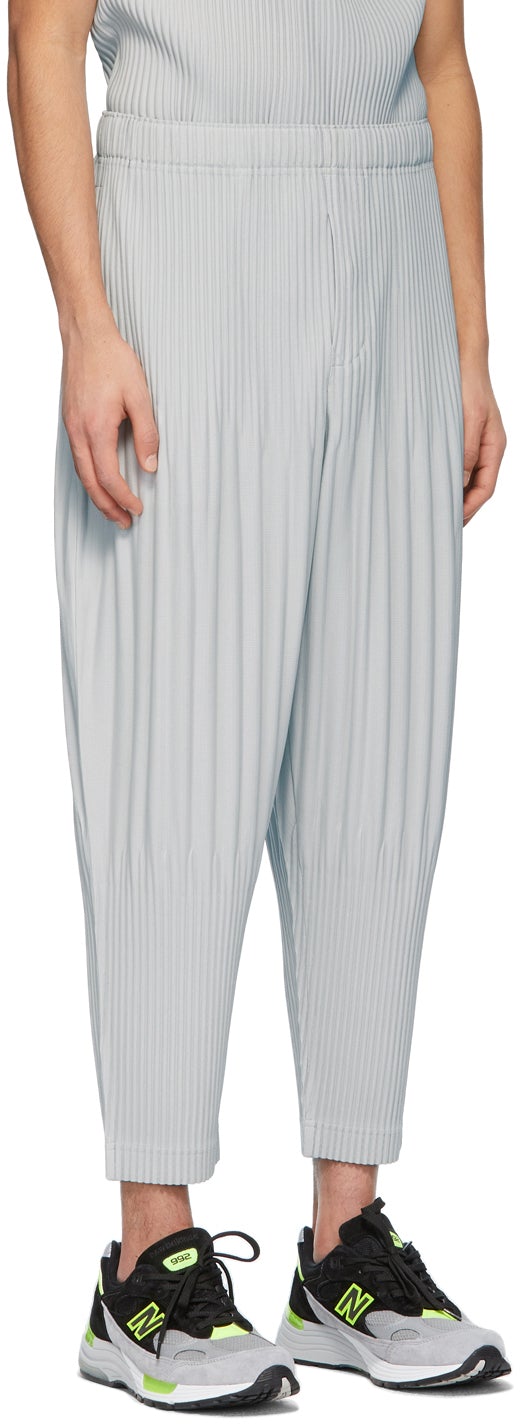 Wide-leg garment-pleated trousers in grey. Mid-rise. Cropped leg. Two-pocket styling. Concealed drawstring at elasticized waistband. Button-fly. Tonal hardware. Supplier color: Light grey 100% polyester. Brand: Homme Plissé Issey Miyake