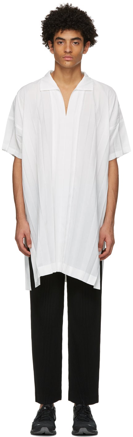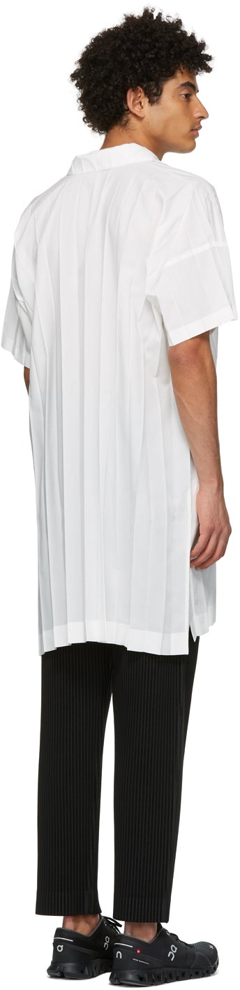 Short sleeve garment-pleated poplin shirt in white. Spread collar. Mock placket at front. Vented side-seams. Overlong hem. Supplier color: White 100% polyester. Brand: Homme Plissé Issey Miyake