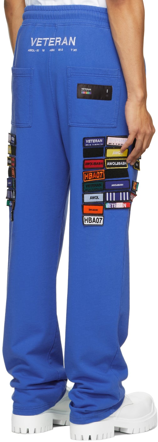 Relaxed-fit French terry lounge pants in blue. Mid-rise. Dropped inseam. Four-pocket styling. Drawstring at elasticized waistband. Detachable graphic patches in multicolor with Velcro fastening at front and back. Logo embroidered in white at back waistband. Textile logo patch in black at back pocket. Mock-fly. Silver-tone hardware. Part of the Veteran capsule collection. Supplier color: Blue 100% cotton. Brand: Hood by Air
