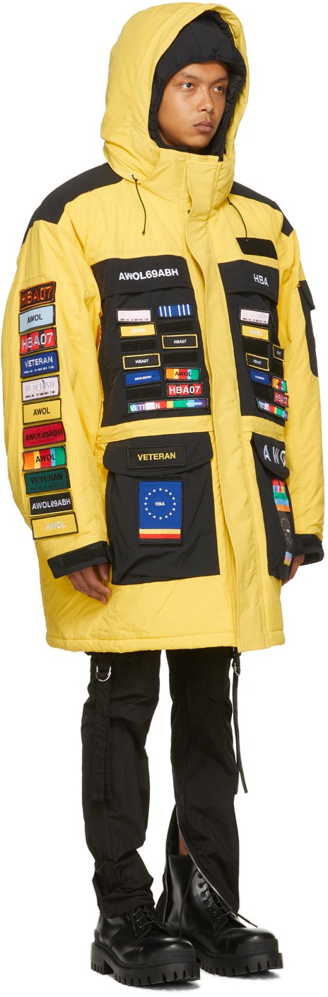 Long sleeve insulated crinkled taffeta jacket in yellow. Trim in black, detachable Velcro graphic patches in multicolor, and embroidered logos in white throughout. Bungee-style drawstring and zip closure at detachable hood. Hood at funnel neck collar. Concealed two-way zip closure with Velcro placket at front. Velcro trim in black and flap pockets at chest. Flap pockets and concealed bungee-style drawstring at waist. Dropped shoulders. Flap pocket at sleeve. Adjustable Velcro tab at cuffs. Zippered pocket and patch pockets at interior. Quilted satin lining in black. Fully lined. Silver-tone hardware. Part of the Veteran capsule collection. Supplier color: Yellow Body: 74% nylon, 26% cotton. Fill: 100% polyester. Lining: 100% polyester. Brand: Hood by Air