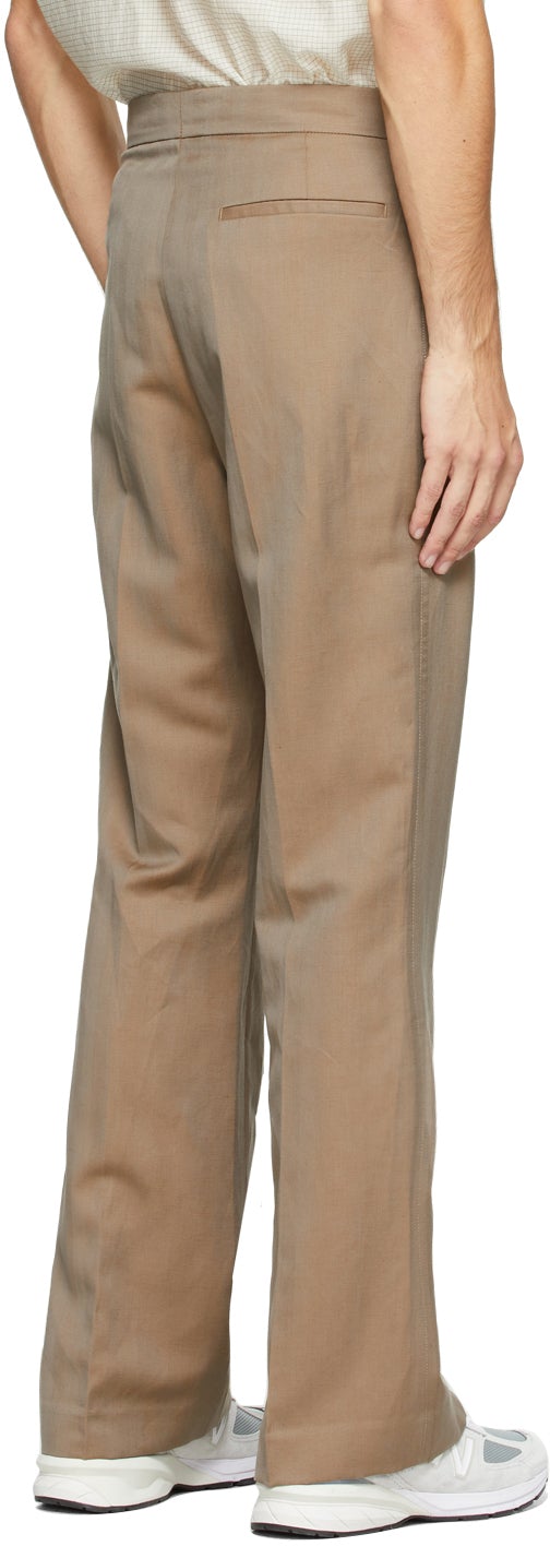 Flared-leg virgin wool and linen-blend herringbone trousers in beige. High-rise. Three-pocket styling. Central crease at front and back. Zip-fly. Silver-tone hardware. Supplier color: Nutmeg Body: 62% virgin wool, 38% linen. Trim: 100% viscose. Brand: HOPE