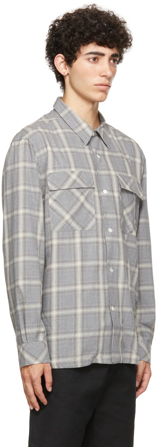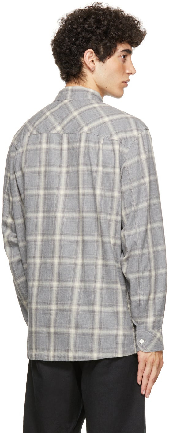 Long sleeve cotton flannel shirt featuring check pattern in tones of beige and grey. Spread collar. Button closure at front. Flap pockets at chest. Single-button barrel cuffs. Mother-of-pearl hardware. Supplier color: Grey check 100% cotton. Brand: HOPE