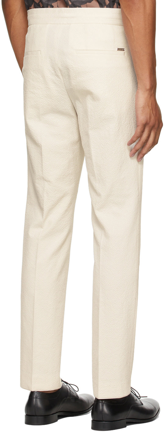 Slim-fit stretch lyocell crepe trousers in beige. Mid-rise. Four-pocket styling. Drawstring in white at waistband. Central pleat at front. Logo plaque at back pocket. Zip-fly. Silver-tone and beige hardware. Supplier color: Natural 97% lyocell, 3% elastane. Brand: Hugo