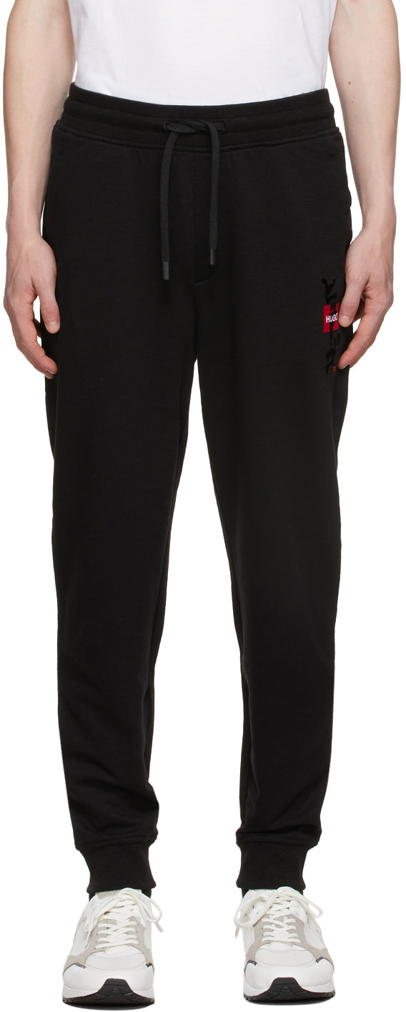 Relaxed-fit French terry lounge pants in black. Mid-rise. Three-pocket styling. Drawstring at elasticized waistband. Logo embroidered in red and black at front. Rib knit cuffs. Mock-fly. Supplier color: Black 100% cotton. Brand: Hugo