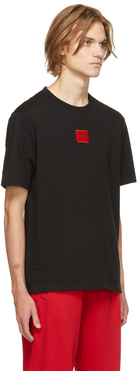Short sleeve French terry T-shirt in black. Rib knit crewneck collar. Logo patch in red and black at chest. Supplier color: Black Body: 100% cotton. Trim: 97% cotton, 3% elastane. Brand: Hugo