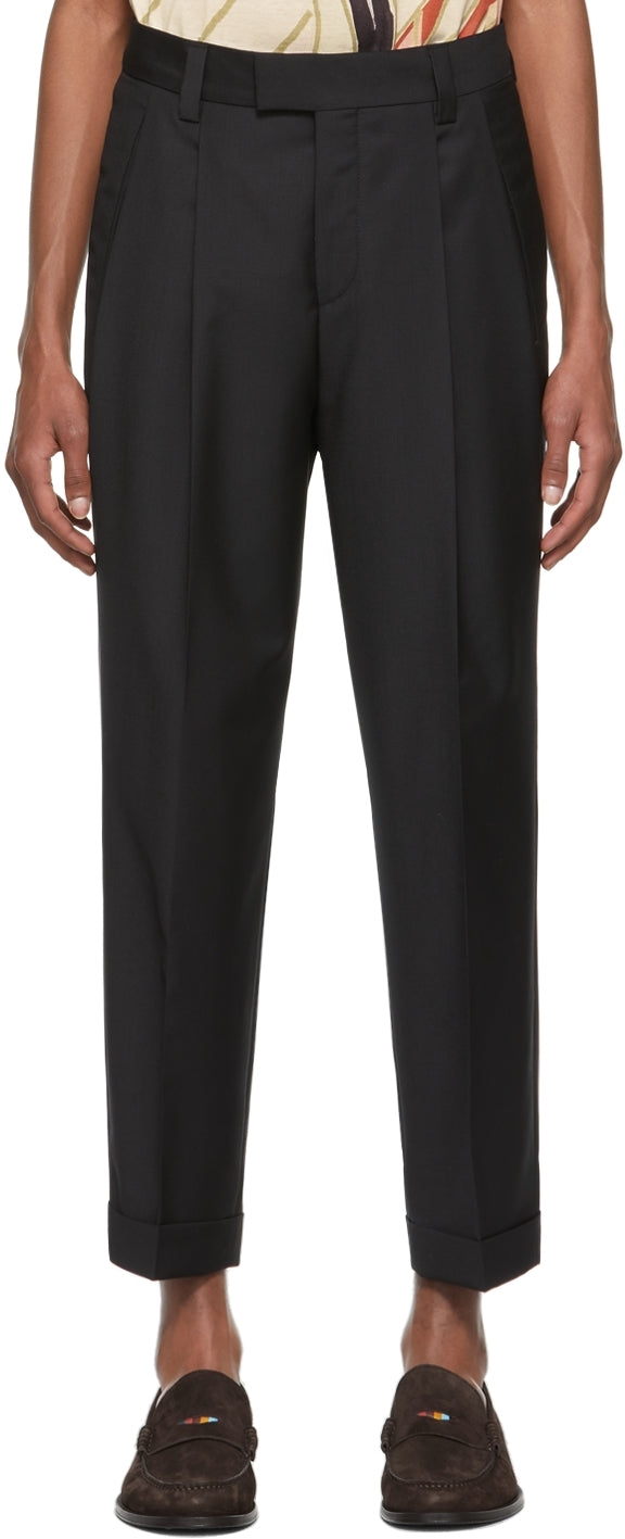 Slim-fit wool twill trousers in black. Mid-rise. Four-pocket styling. Belt loops at waistband. Central creases at front and back. Tonal grosgrain trim and reflective trim at outseams. Unlined. Zip-fly. Supplier color: Black Body: 100% virgin wool. Lining: 100% viscose. Brand: Hugo