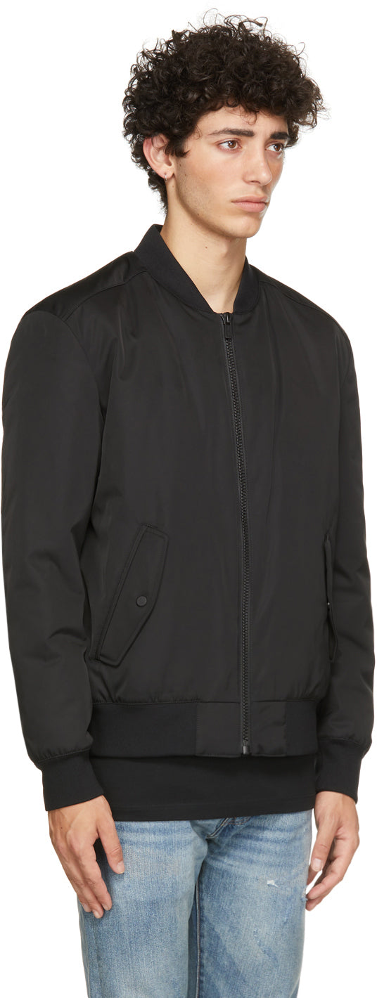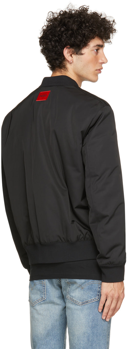 Long sleeve padded twill bomber jacket in black. Water-repellent. Rib knit stand collar, cuffs, and hem. Zip closure at front. Flap pockets at waist. Concealed eyelet vents at armscyes. Textile logo patch in red and black at back collar. Welt pocket at interior. Tonal logo-woven viscose-blend satin lining. Fully lined. Tonal hardware. Supplier color: Black Body: 100% polyester. Trim 1: 99% polyester, 1% elastane. Trim 2: 100% polyester. Fill: 100% polyester. Lining: 54% polyester, 46% viscose. Brand: Hugo