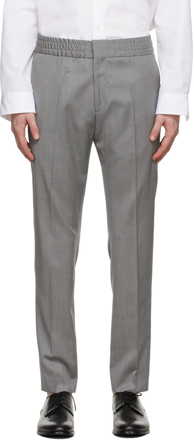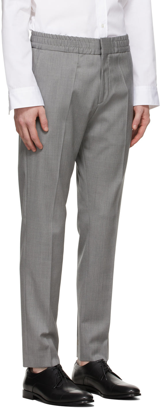 Slim-fit virgin wool twill trousers in grey. Mid-rise. Four-pocket styling. Concealed drawstring at elasticized waistband. Central creases at front and back. Unlined. Zip-fly. Gunmetal-tone hardware. Supplier color: Silver 100% virgin wool. Brand: Hugo