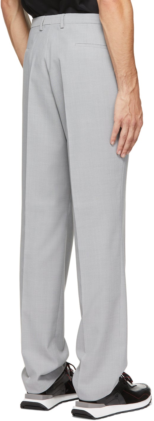 Straight-leg stretch woven virgin wool-blend trousers in grey. Mid-rise. Four-pocket styling. Belt loops at waistband. Central creases at front and back. Zip-fly. Tonal hardware. Supplier color: Medium grey Body: 51% polyester, 48% virgin wool, 1% elastane. Trim: 100% viscose. Brand: Hugo