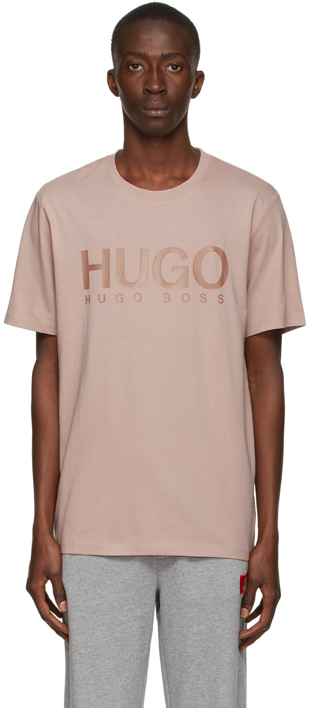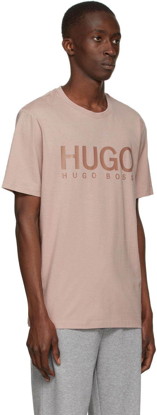 Short sleeve cotton jersey T-shirt in pink. Rib knit crewneck collar. Tonal logo printed at front. Supplier color: Light pastel 100% cotton. Brand: Hugo