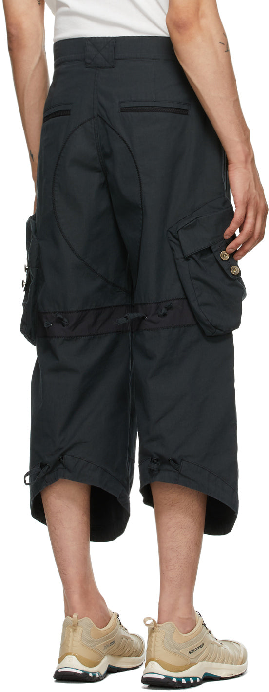 Relaxed-fit cotton twill trousers in black. Mid-rise. Cropped leg. Four-pocket styling. Belt loops at waistband. Zippered cargo pocket at outseams. Concealed drawstring at hem. Antiqued bronze-tone hardware. Zip-fly. Supplier color: Black Body: 100% cotton. Trim: 100% nylon. Brand: Hyein Seo