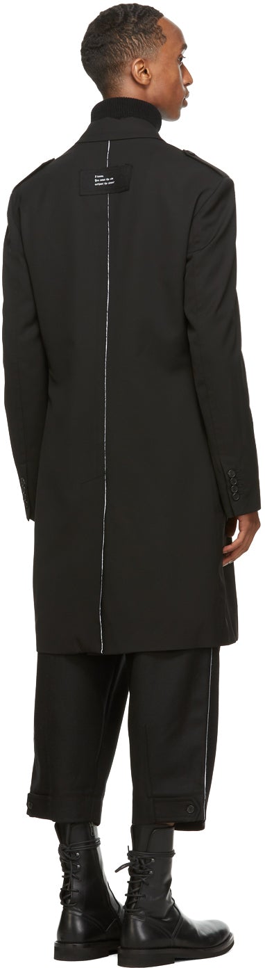 Long sleeve virgin wool twill coat in black. Raw edges throughout. Notched lapel collar. Three-button closure at front. Welt pocket at chest. Flap pockets at waist. Epaulets. Four-button surgeon's cuffs. Textile graphic patch at back. Central vent at back hem. Welt pockets at interior. Satin lining in white. Fully lined. Tonal logo-engraved hardware. Supplier color: Black Body: 100% virgin wool. Lining 1: 100% viscose. Lining 2: 55% modal, 45% cotton. Lining 3: 60% acetate, 40% viscose. Brand: Isabel Benenato