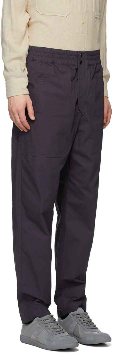 Tapered woven cotton trousers in navy. High-rise. Four-pocket styling. Elasticized waistband. Button-fly. Silver-tone hardware. Supplier color: Faded night 100% cotton. Brand: Isabel Marant
