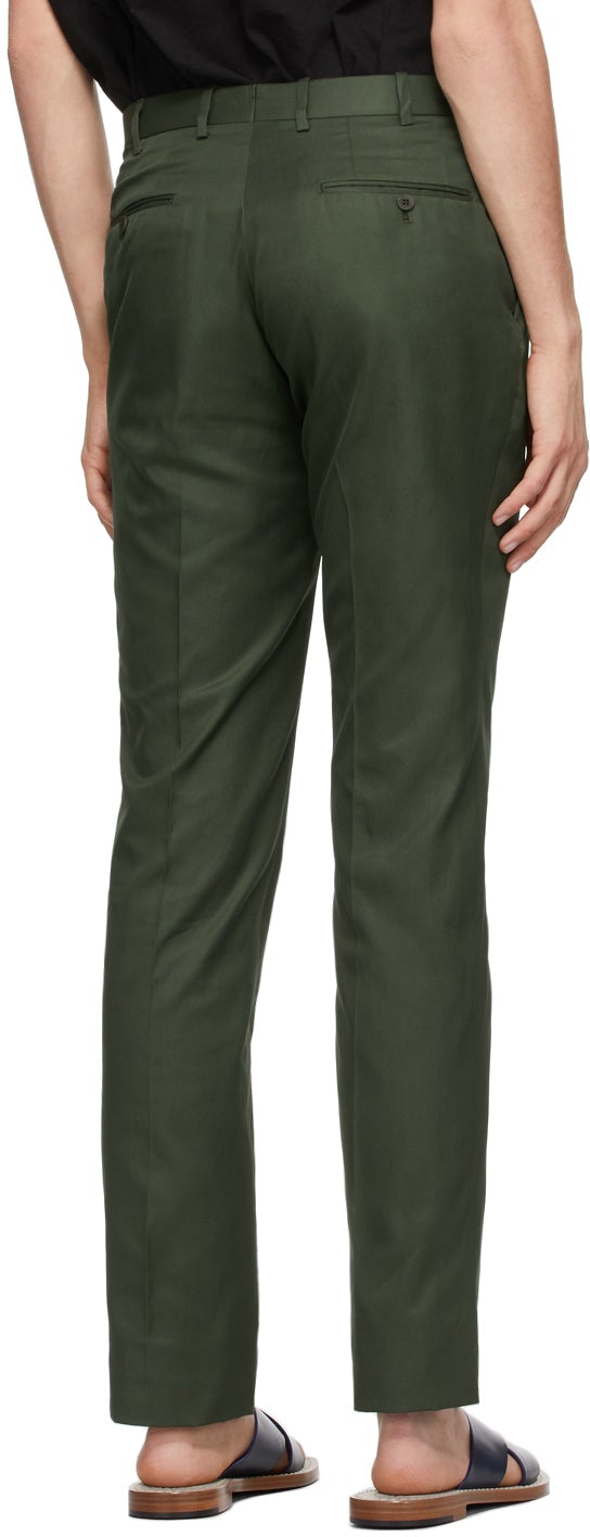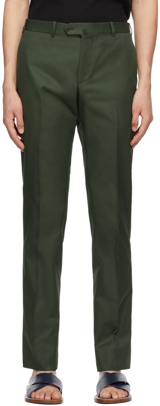 Slim-fit cotton twill trousers in green. Mid-rise. Five-pocket styling. Belt loops at waistband. Central creases at front and back. Unfinished cuffs. Zip-fly. Tonal hardware. Supplier color: Green 100% cotton. Brand: Isaia