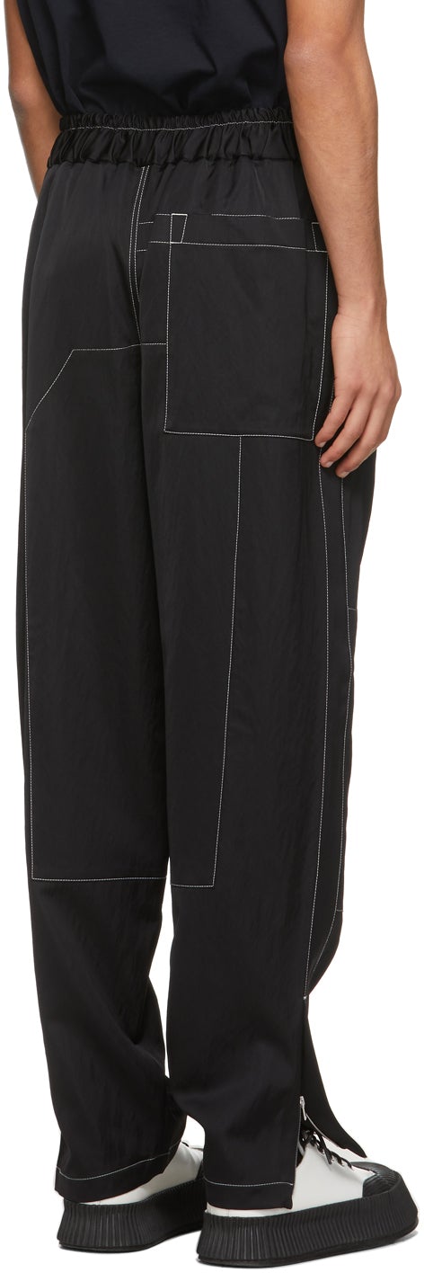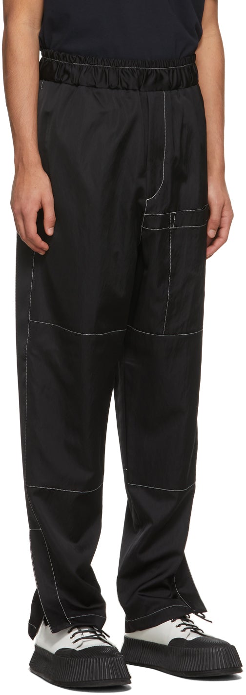 Relaxed-fit crinkled stretch viscose and nylon-blend satin trousers in black. Mid-rise. Paneled construction. Three-pocket styling. Elasticized waistband. Patch pocket at front leg. Zippered vent at cuffs. Tonal cotton poplin lining. Partially lined. Zip-fly. Silver-tone hardware. Contrast stitching in white. Supplier color: Black Body: 58% viscose, 38% polyamide, 4% elastane. Lining: 100% cotton. Brand: Jil Sander