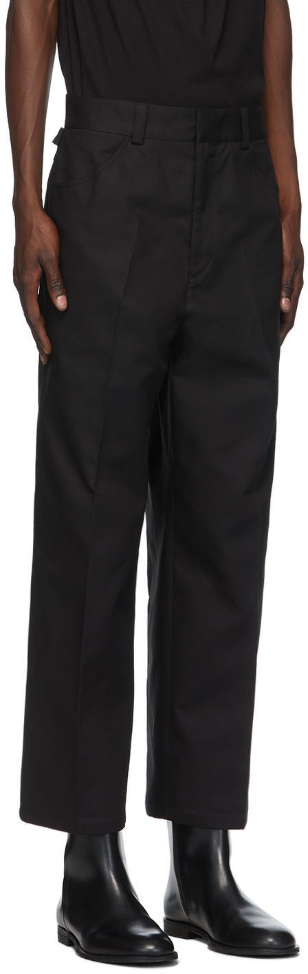 Straight-leg cotton piqué trousers in black. Mid-rise. Cropped leg. Four-pocket styling. Belt loops at waistband. Central creases at front and back. Adjustable strap with button fastening at back waist. Zip-fly. Silver-tone hardware. Supplier color: Black 100% cotton. Brand: Jil Sander