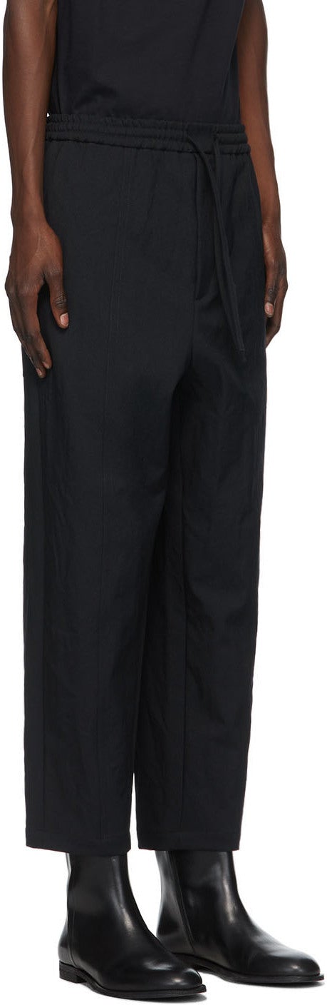 Relaxed-fit panelled serge trousers in navy. Mid-rise. Cropped leg. Four-pocket styling. Drawstring at elasticized waistband. Zip-fly. Silver-tone hardware. Supplier color: Midnight blue Body: 100% polyester. Lining: 100% cotton. Brand: Jil Sander