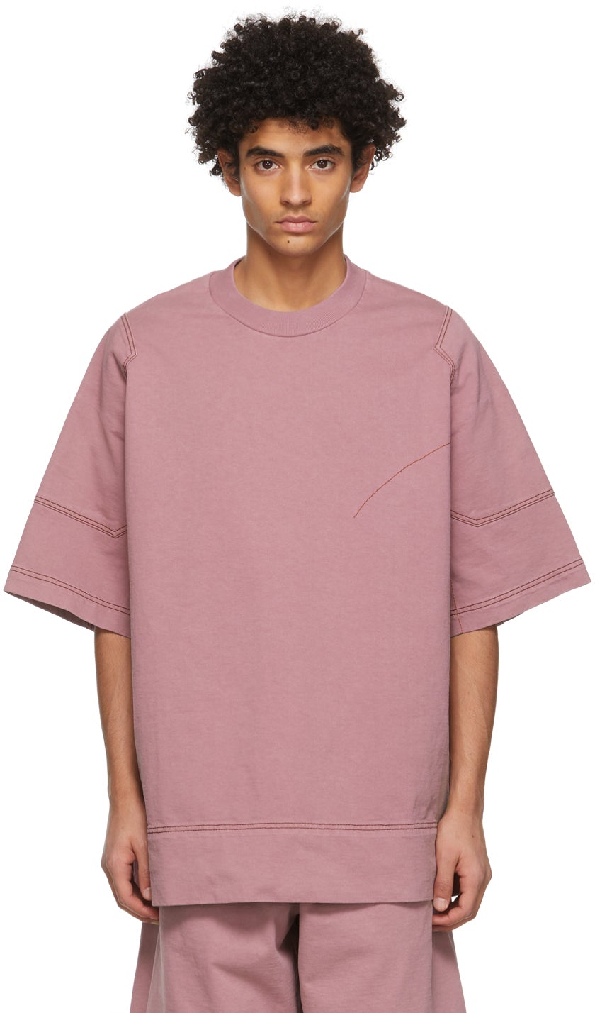 Short sleeve paneled cotton jersey T-shirt in pink. Topstitching in red and burgundy throughout. Rib knit crewneck collar. Dropped shoulders. Vented side-seams. Supplier color: Magenta 100% cotton. Brand: Jil Sander