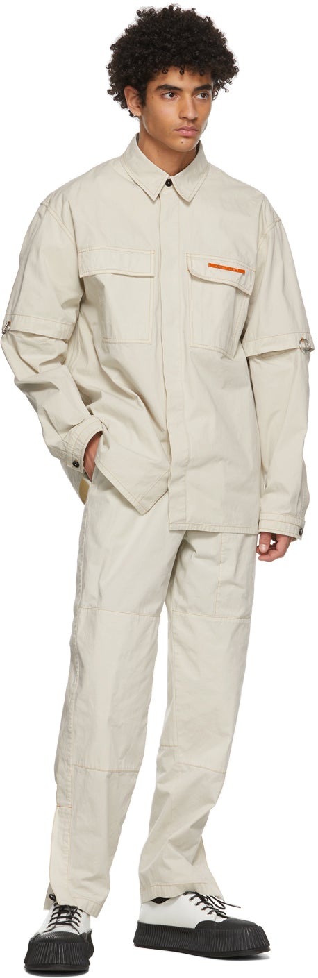 Straight-leg cotton and nylon-blend gabardine trousers in taupe. Mid-rise. Four-pocket styling. Elasticized waistband. Zippered vent at cuffs. Unlined. Zip-fly. Silver-tone hardware. Contrast stitching in orange. Supplier color: Pebble 70% cotton, 30% polyamide. Brand: Jil Sander