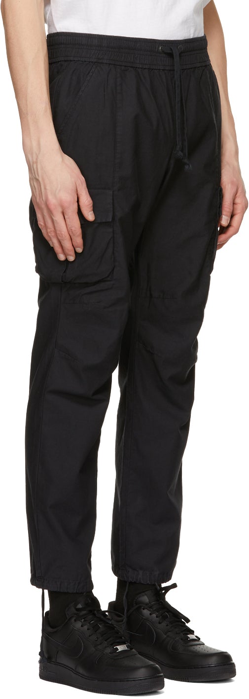 Slim-fit cotton sateen cargo pants in black. Mid-rise. Fading throughout. Four-pocket styling. Drawstring at elasticized waistband. Flap pocket and patch pocket at outseams. Darts at knees. Drawstring at cuffs. Supplier color: Black 100% cotton. Brand: John Elliott