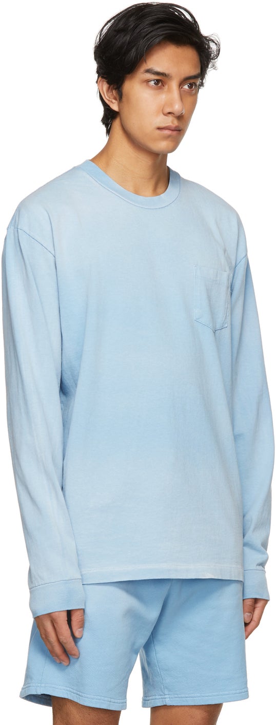 Long sleeve cotton jersey T-shirt in blue. Fading throughout. Rib knit crewneck collar and cuffs. Patch pocket at chest. Supplier color: Stratus 100% cotton. Brand: John Elliott