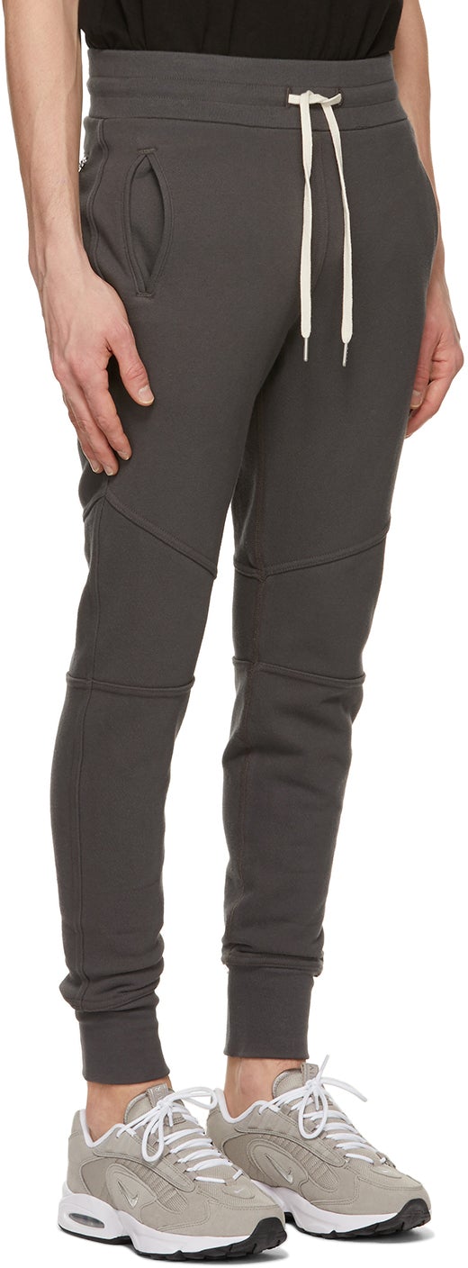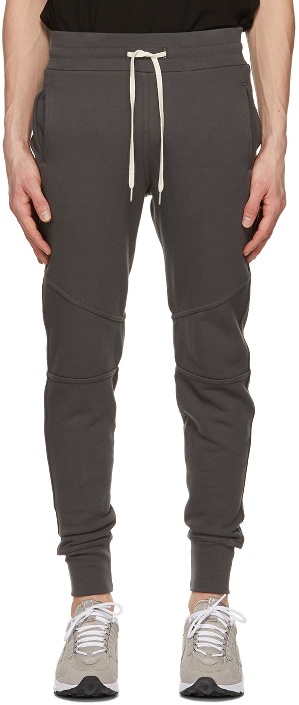 Slim-fit paneled French terry lounge pants in grey. Mid-rise. Dropped inseam. Three-pocket styling. Drawstring at rib knit waistband. Rib knit cuffs. Silver-tone hardware. Supplier color: Charcoal 100% cotton. Brand: John Elliott