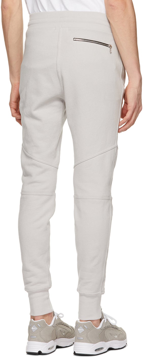 Slim-fit paneled French terry lounge pants in light grey. Mid-rise. Dropped inseam. Three-pocket styling. Drawstring at rib knit waistband. Rib knit cuffs. Silver-tone hardware. Supplier color: Moon grey 100% cotton. Brand: John Elliott