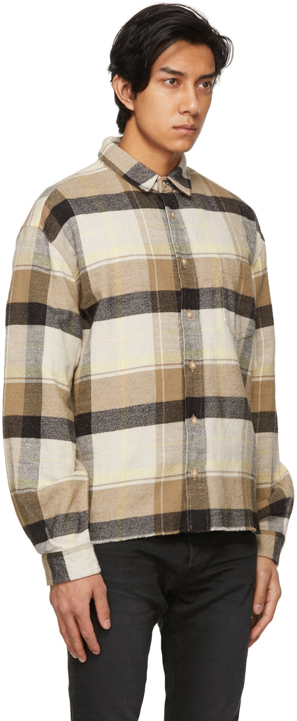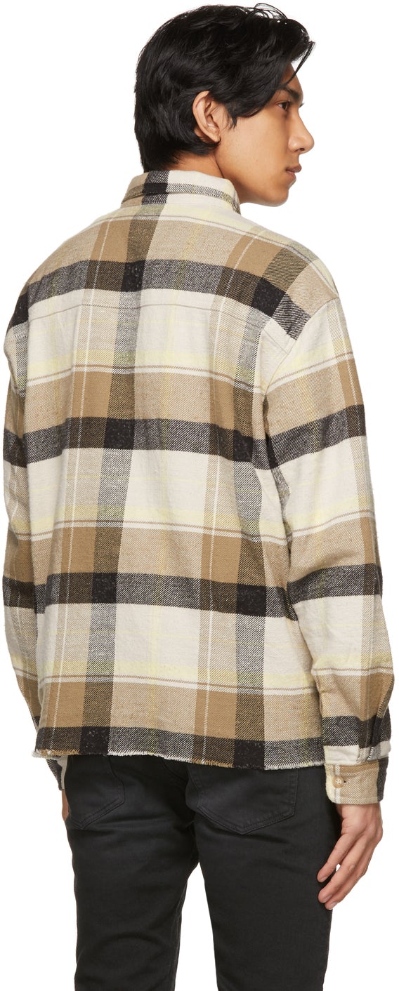 Long sleeve brushed cotton twill shirt featuring check pattern in khaki, off-white, green, and black. Spread collar. Button closure at front. Patch pocket at chest. Single-button barrel cuffs. Raw edge at hem. Supplier color: Cyclone check 100% cotton. Brand: John Elliott