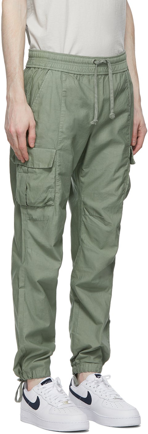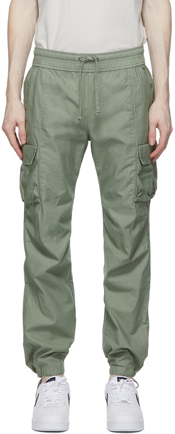 Relaxed-fit cotton sateen cargo pants in khaki. Mid-rise. Four-pocket styling. Drawstring at elasticized waistband. Darts at front waistband and knees. Press-stud flap pocket at outseams. Drawstrings at cuffs. Antiqued silver-tone hardware. Supplier color: sage 100% cotton. Brand: John Elliott