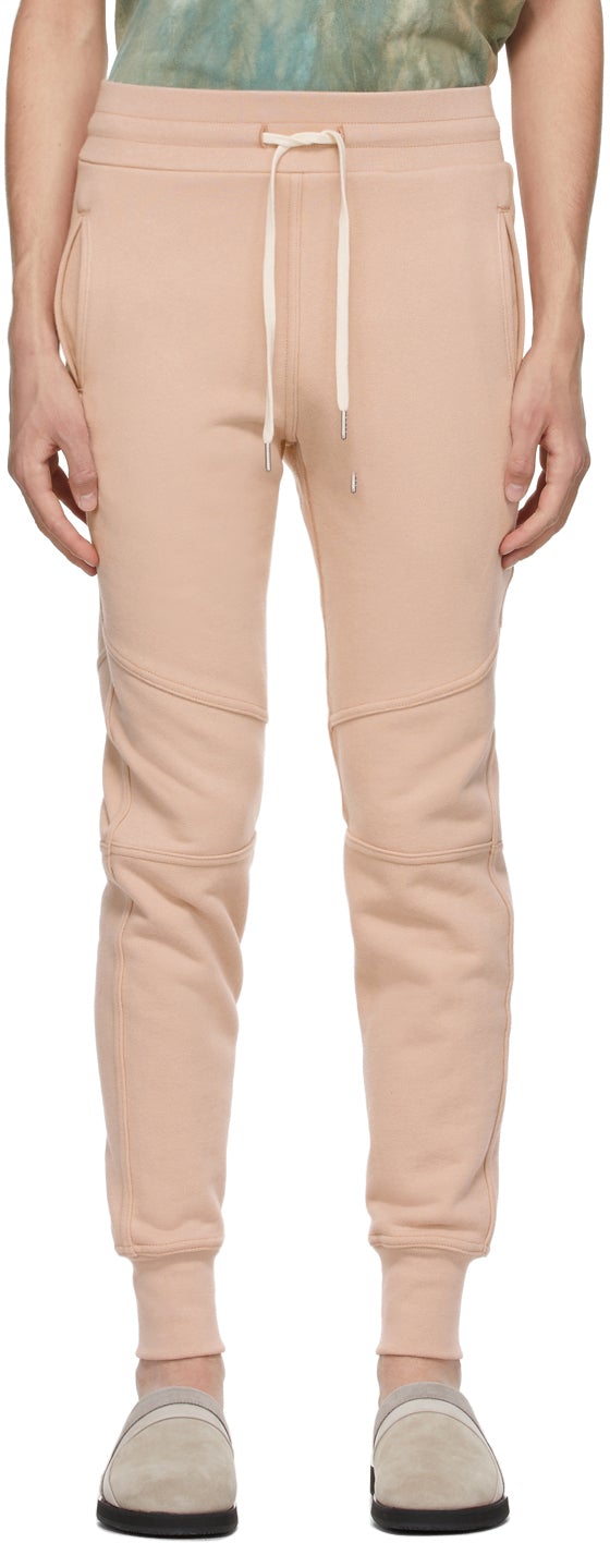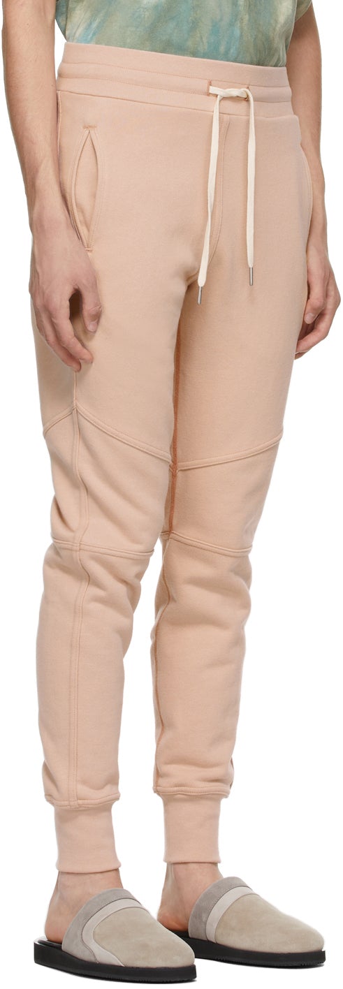 Slim-fit paneled French terry lounge pants in pink. Mid-rise. Dropped inseam. Three-pocket styling. Drawstring at rib knit waistband. Rib knit cuffs. Silver-tone hardware. Supplier color: Twilight Body: 100% cotton. Trim: 95% cotton, 5% polyurethane. Brand: John Elliott